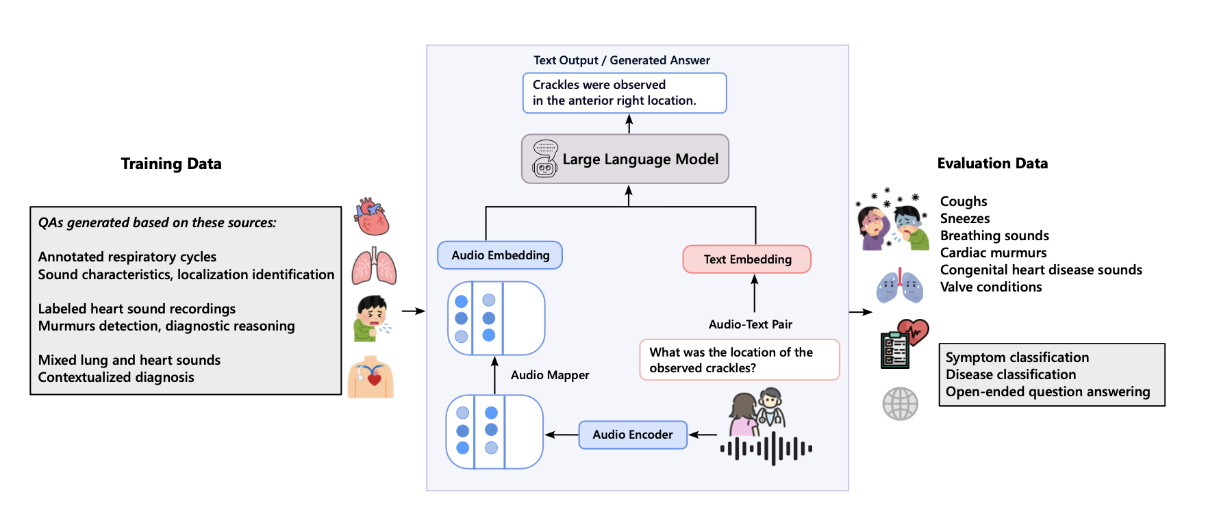 The model combines a self-supervised medical audio encoder with a language model by aligning both modalities in a shared latent space. This enables it to interpret subtle audio features—such as murmurs, crackles, and timing patterns—and integrate them with the semantic content of diverse clinical queries.