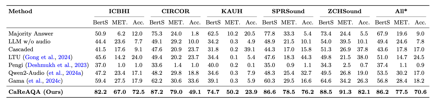 CaReAQA is an open-ended audio question answering model designed to enable large language models to reason over real-world auscultation recordings of heart and lung sounds. Unlike traditional diagnostic systems that rely on predefined labels or closed-form outputs, CaReAQA generates free-form diagnostic responses to open-ended clinical questions, closely resembling human clinical reasoning.