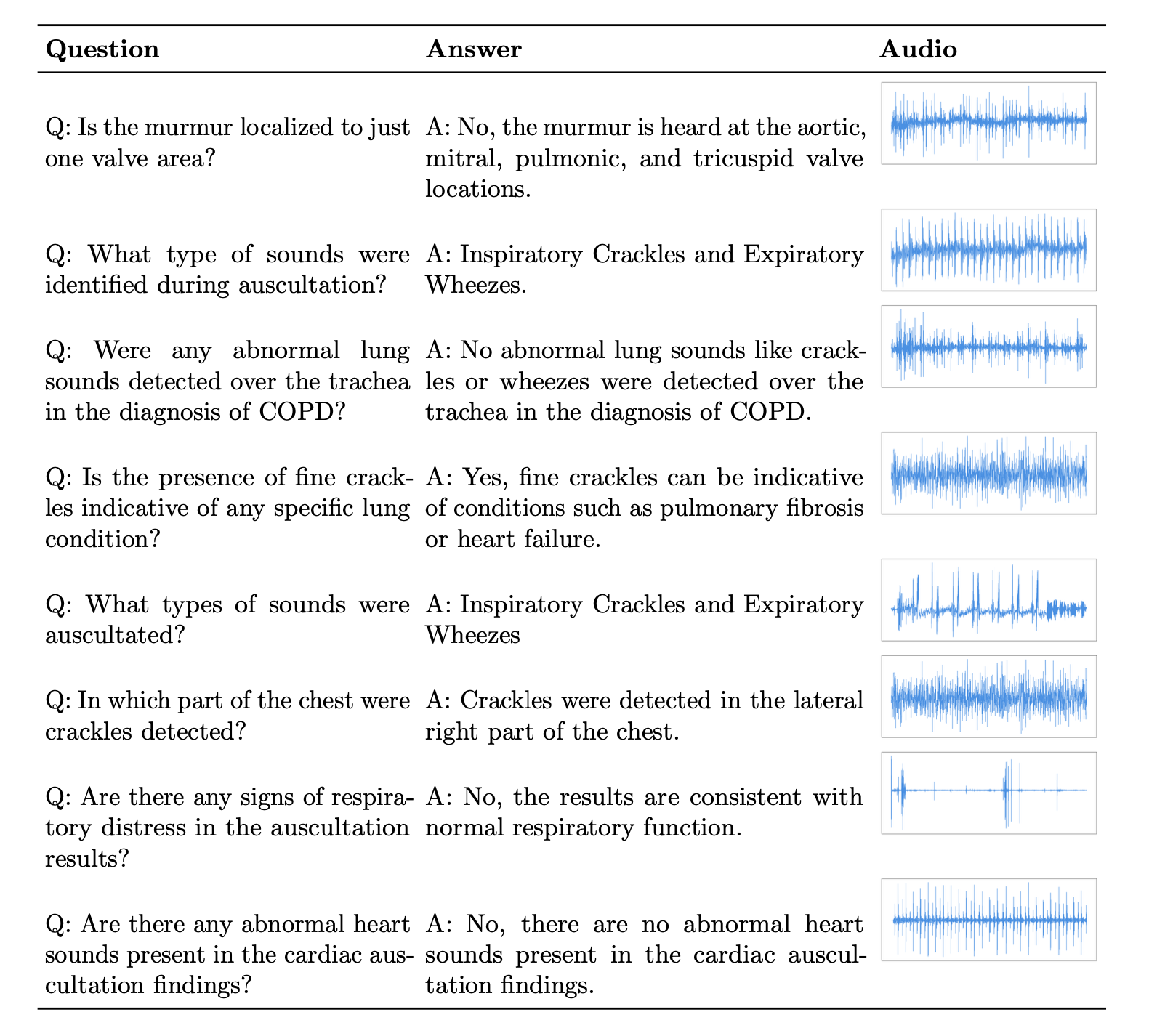 A question-answering model designed to enable large language models to perform diagnostic reasoning over auscultation audio recordings from real-world clinical data.